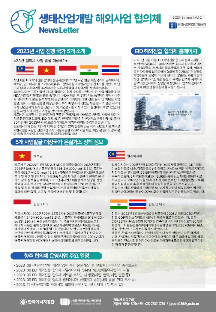 [뉴스레터] 생태산업개발 해외사업 협의체_News Letter_Vol.2 페이지 정보 관리자 조회239회 작성일23-08-18 10:27 목록 본문 이전글[백서공유] 2022년 생태산업개발을 통한 미세먼지 및 온실가스 감축 해외사업 협의체 운영사업 백서 23.08.24 다음글[자문지원] 생태산업개발 해외사업 협의체 참여기업 대상 온실가스 컨설팅 자문 지원(무료 컨설팅) 23.07.31